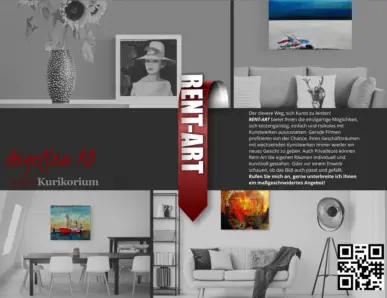 Der clevere Weg, sich Kunst zu leisten! RENT-ART bietet Ihnen die einzigartige Möglichkeit, sich kostengünstig, einfach und risikolos mit Kunstwerken auszustatten. Gerade Firmen profitieren von der Chance, ihren Geschäftsräumen mit wechselnden Kunstwerken immer wieder ein neues Gesicht zu geben. Auch Privatleute können Rent-Art die eigenen Räumen individuell und kunstvoll gestalten. Oder vor einem Erwerb schauen, ob das Bild auch passt und gefällt. Rufen Sie mich an, gerne unterbreite ich Ihnen ein maßgeschneidertes Angebot!