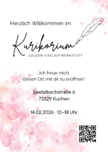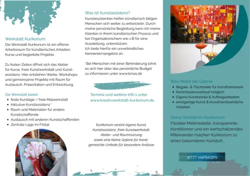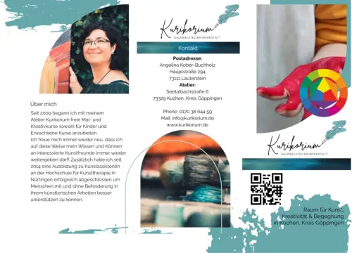 Die Werkstatt Kurikorium ist ein offener Arbeitsraum für künstlerisches Arbeiten, Kurse und begleitete Projekte. Zu festen Zeiten öffnet sich das Atelier für Kurse, freie Kunstwerkstatt und Kunstassistenz. Hier entstehen Werke, Workshops und gemeinsame Projekte mit Raum für Austausch, Präsentation und Entwicklung. Die Werkstatt bietet: feste Kurstage / freie Malwerkstatt inklusive Kunstassistenz * Raum und Materialien für andere Kunstschaffende Austausch mit anderen Kunstschaffenden Zentrale Lage im Filstal
